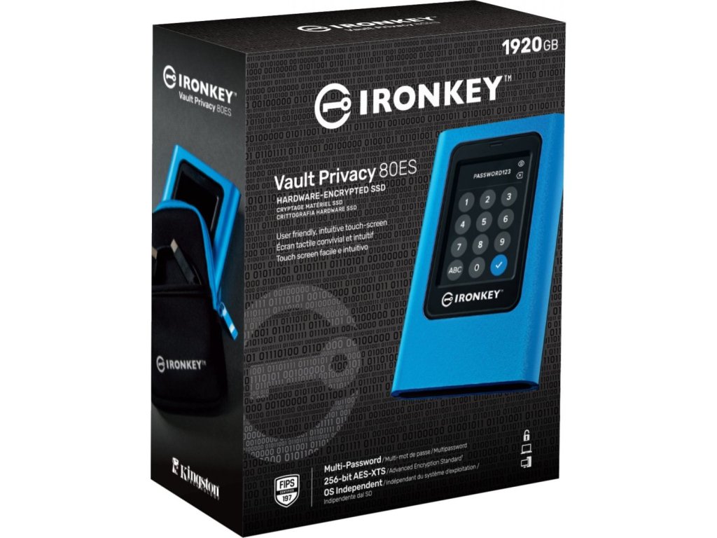 Externí SSD disk Kingston IronKey Vault Privacy 80 je první inovativní hardwarově šifrovaný externí SSD disk firmy Kingston s dotykovou obrazovkou pro ochranu dat. VP80ES chrání proti útokům hrubou silou a útokům BadUSB s digitálně podepsaným firmwarem. Ochrana před útoky hrubou silou šifrovaně vymaže disk, pokud jsou ve výchozím nastavení 15× za sebou nesprávně zadána hesla správce a uživatele. Disk má certifikaci FIPS 197 s 256bitovým šifrováním XTS-AES využívajícím certifikovaný bezpečnostní mikroprocesor Common Criteria EAL5+ (CC EAL5+) a je v souladu s TAA.