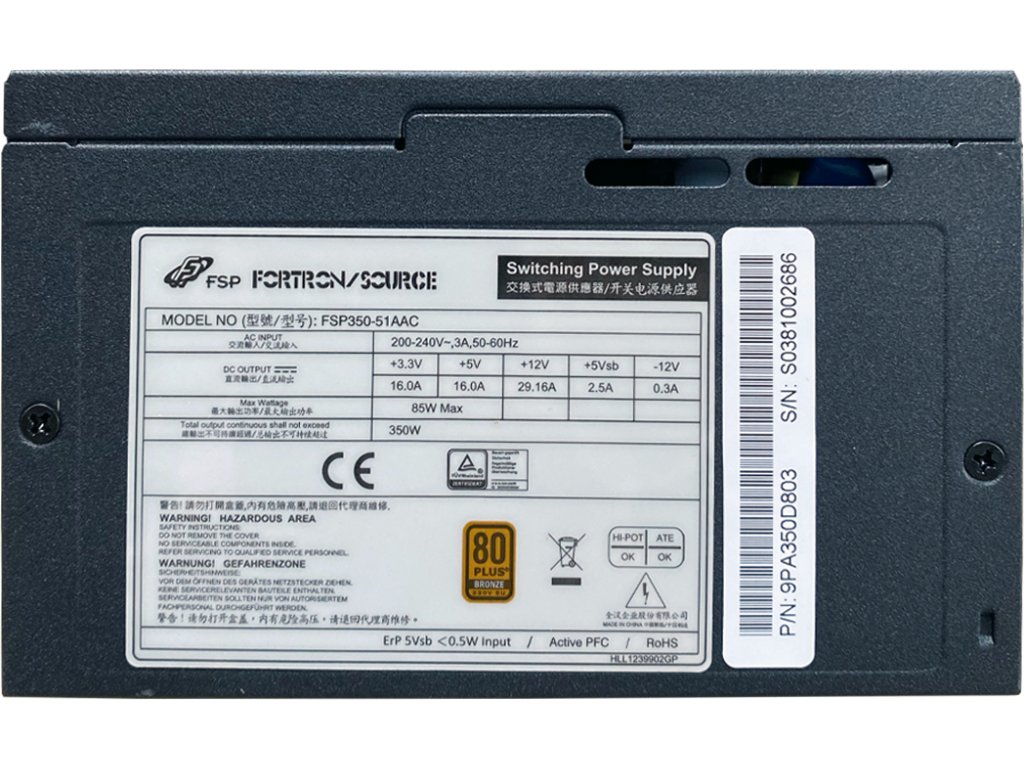 ATX zdroj Fortron FSP350-51AAC 85+ s výkonem 350 W. Pro dlouhodobě spolehlivý provoz je zdroj Fortron FSP350-51AAC 85+ vybavený 120mm ventilátorem. Přívod energie je možné zastavit pomocí vestavěného vypínače.