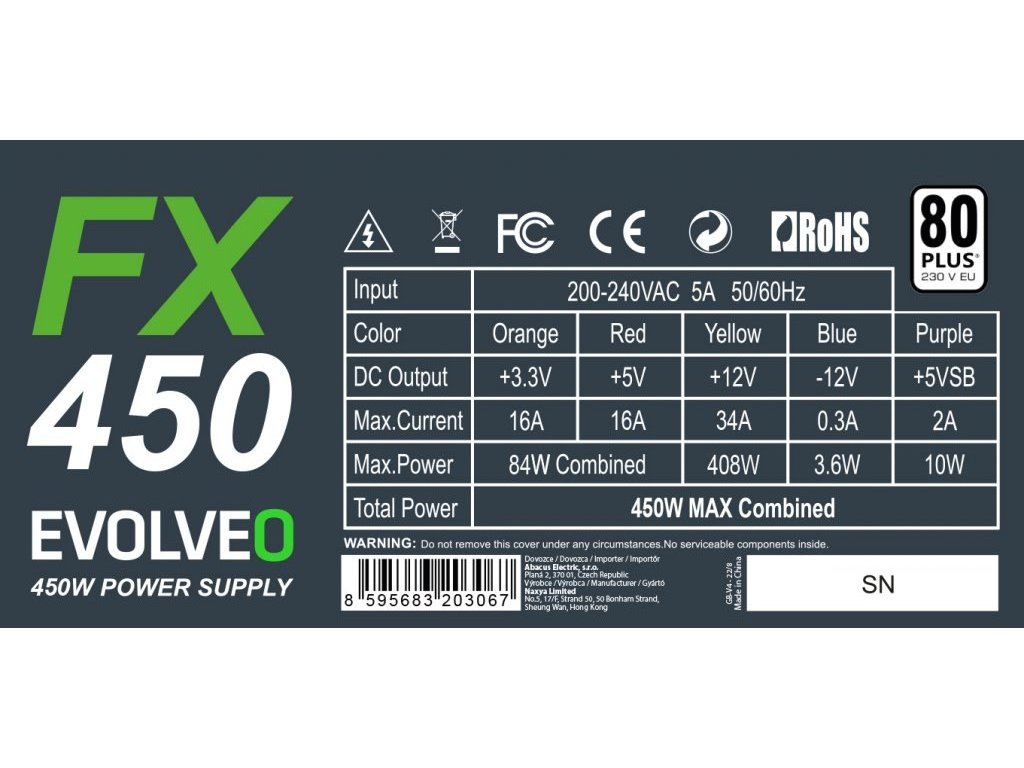 EVOLVEO FX 450, zdroj 450W ATX, 14cm, tichý, 80+, bulk, záruka 3 roky