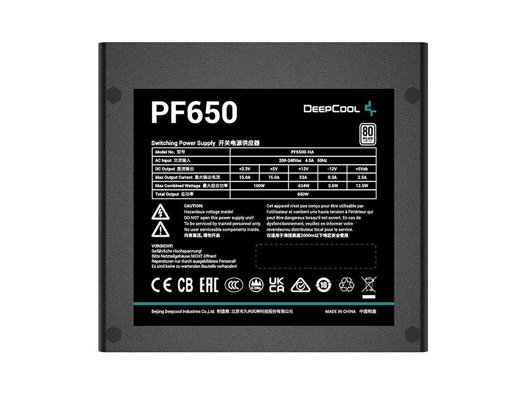 DEEPCOOL PF650 650 WNapájecí zdroj osazen tichým 120 mm ventilátorem. Účinnost zdroje splňuje certifikaci 80PLUS Standard.