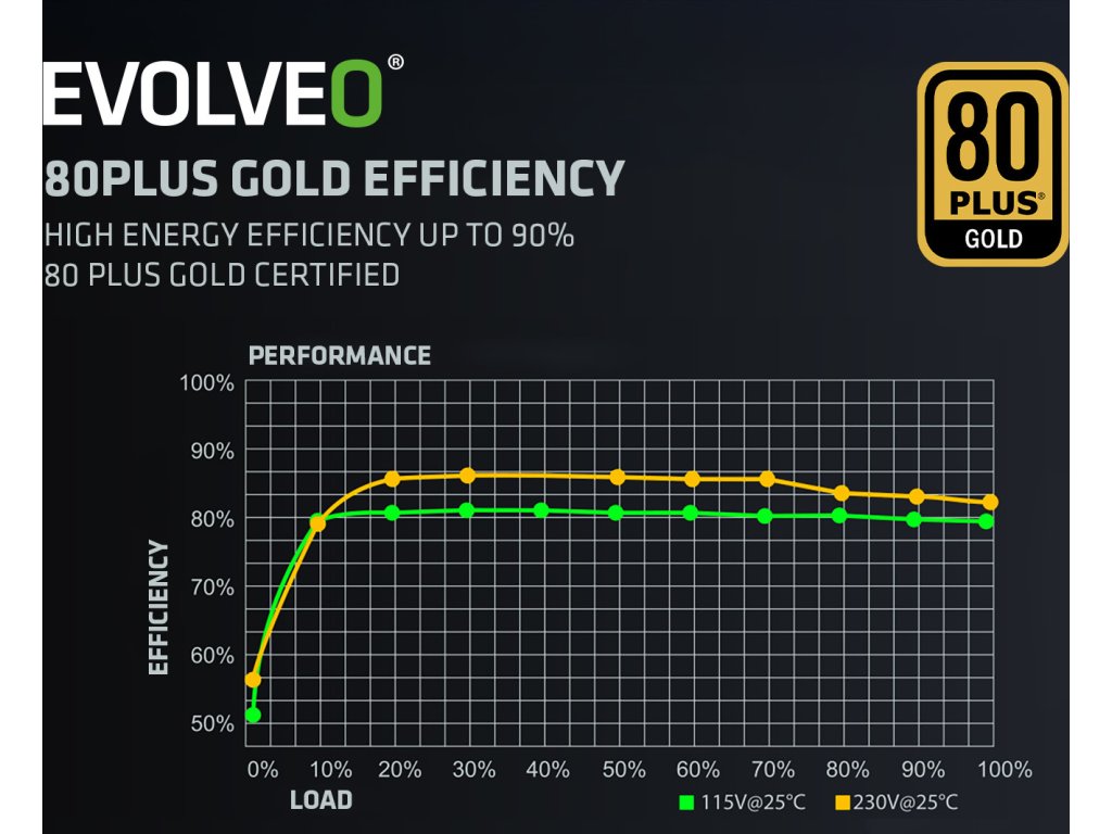 PC zdroj EVOLVEO G750-BK je hrdým držitelem certifikace 80 PLUS Gold, která slibuje až 92% účinnost (při běžném 50% zatížení). Minimální ztráty energie a nízké zahřívání jdou přitom ruku v ruce s tichým chodem 140mm HDB ventilátoru – ten má mezi hřídelí a ložisky speciální olejovou vrstvu a jeho tření je nepatrné, takže hlučnost zůstává na minimu. S tímto zdrojem vás zkrátka hučení ventilátoru neruší – slyšet je jen svištění kol vaší formule nebo řinčení zbraní vaší armády.Prémiové japonské kondenzátory, jimiž je tento zdroj vybaven, jsou spolehlivé a extra výkonné. Navíc odolávají teplotám až 105 °C. A jejich životnost? Až 20 let! I díky nim se můžete bezhlavě (ale taky bez obav) pustit do jakékoliv herní výzvy.