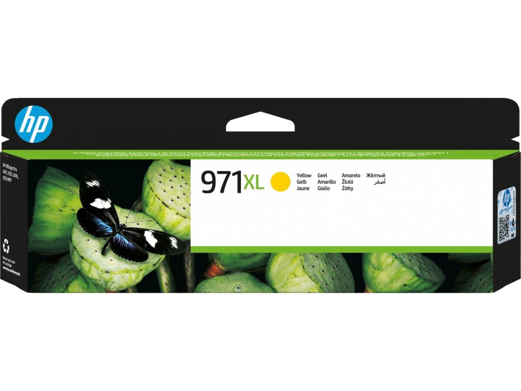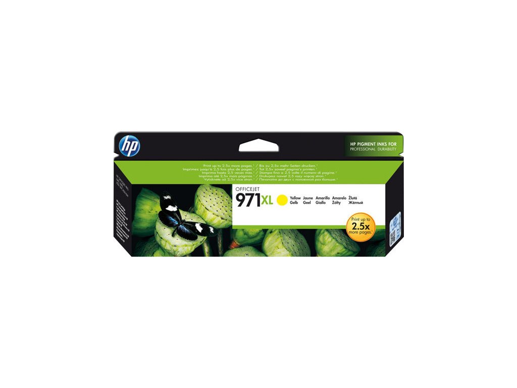 Žlutá inkoustová kazeta HP 971XL, výtěžnost 6600 stránek při 5% pokrytí. Kompatibilita s HP Officejet Pro X451/X551dw, Officejet Pro X476/X576dw.