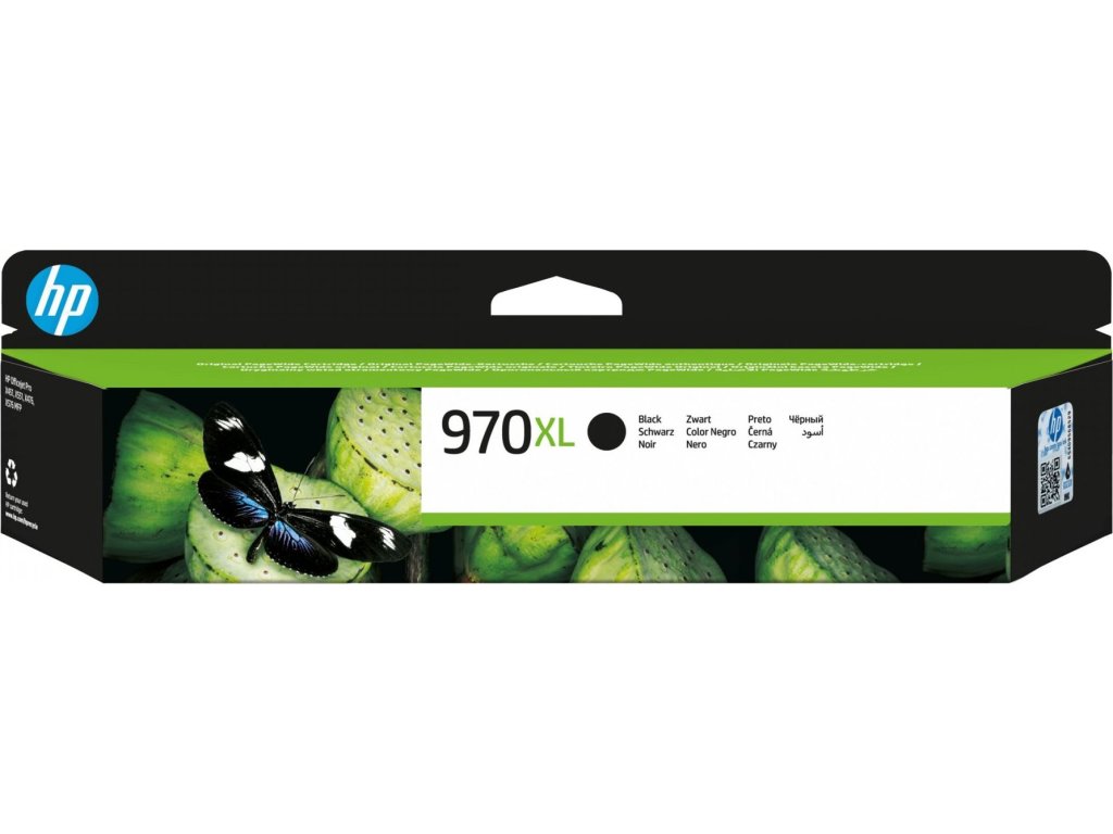 Černá inkoustová kazeta HP 970XL, výtěžnost 9200 stránek při 5% pokrytí. Kompatibilita s HP Officejet Pro X451/X551dw, Officejet Pro X476/X576dw.