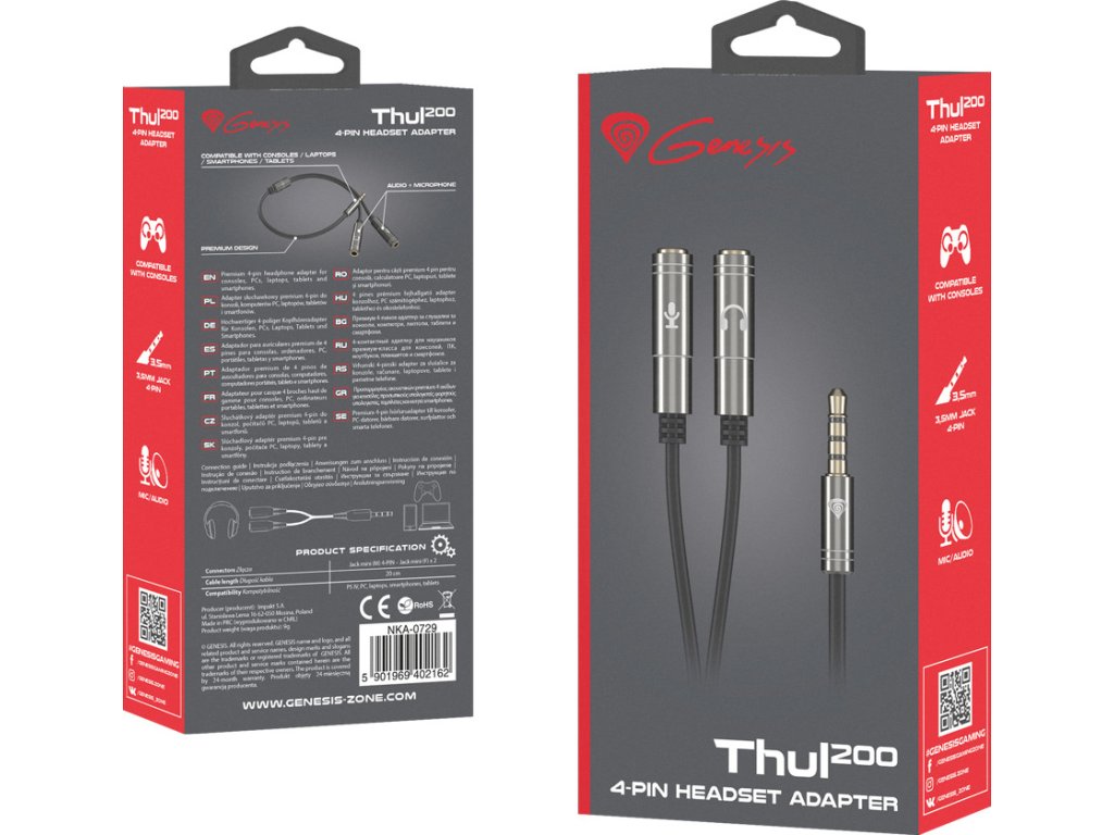 Umožňuje připojení náhlavní soupravy se dvěma 3,5mm jack konektory (zvuk + mikrofon) k 3,5mm 4pin zásuvce jack.