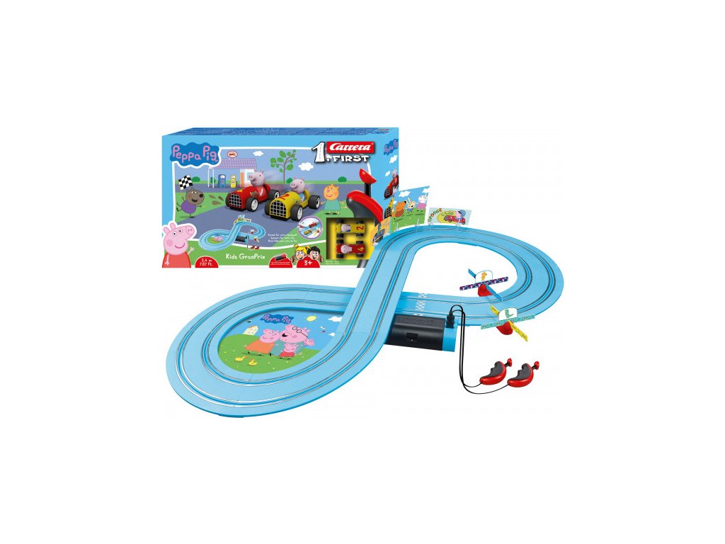 Autodráha Carrera FIRST dlouhá 2,4m s auty ze seriálu Prasátko Pepa (Peppa Pig), pro děti od 3 let, na baterie, obsahuje rovinky, zatáčky, točící vrtule, ovladače a dekorace s tématikou Prasátko Peppa.