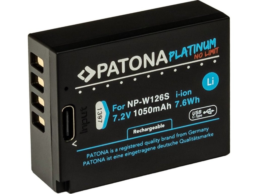 PATONA PLATINUM baterie kompatibilní s Fuji NP-W126SKompatibilní baterie pro fotoaparáty Fuji. Baterie se vyznačují vysokou kvalitou, mají integrovanou ochranu proti přetížení, přebití a přehřívání. Nabíjení baterie je realizováno skrze zabudovaný konektor USB-C. Lze ji nabíjet připojením kabelu do USB-C konektoru (např. z počítače, powerbanky či nabíječkou na mobilní telefon) tak i v klasické nabíječce na Li-ion. Nabíjecí proud max. 1,2 A (vyšší vstupní proudy jsou automaticky redukovány pomocí IC ovládání baterie).