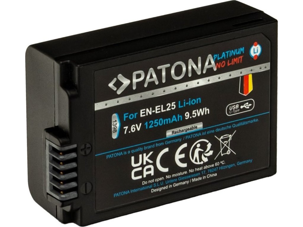 PATONA PLATINUM kompatibilní s Nikon EN-EL25Kompatibilní baterie pro fotoaparáty Nikon. Baterie se vyznačují vysokou kvalitou, mají integrovanou ochranu proti přetížení, přebití a přehřívání. Nabíjení baterie je realizováno skrze zabudovaný konektor USB-C. Lze ji nabíjet připojením kabelu do USB-C konektoru (např. z počítače, powerbanky či nabíječkou na mobilní telefon) tak i v klasické nabíječce na Li-ion. Nabíjecí proud max. 1,2 A (vyšší vstupní proudy jsou automaticky redukovány pomocí IC ovládání baterie).