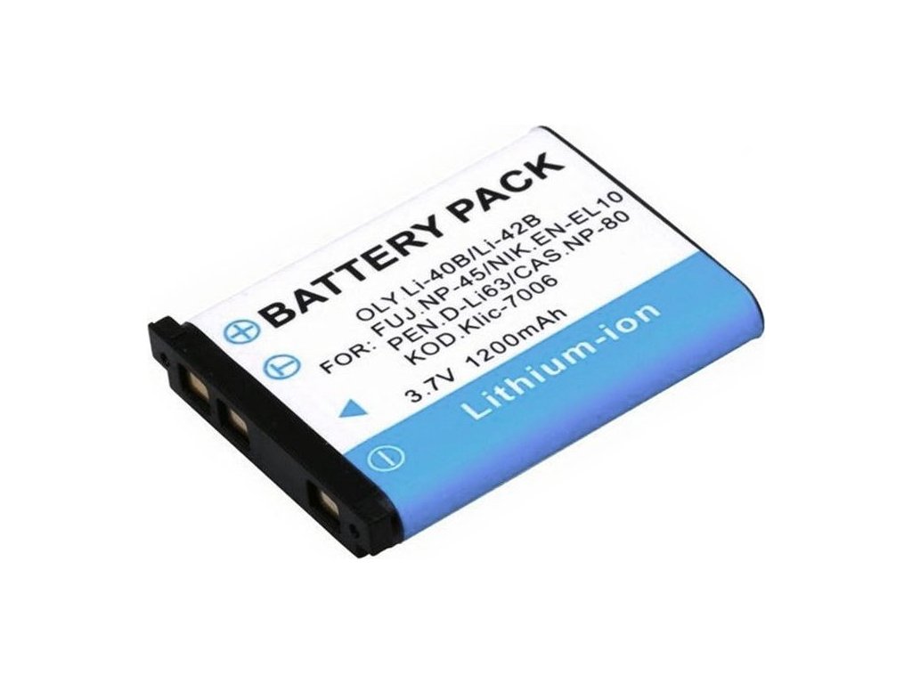 Nahrazuje baterie: NP-45, KLIC-7006, EN-EL10, Li-40B, Li-42B, D-Li63, NP-80, D-LI108, DLI-216, D-LI63, DR9664, DS5370, D016, D016-05-8023, EN-EL10, GB-10A, KLIC-7006, LI-40B, LI-42B, NP45, NP-45, NP-45A, NP-80, NP-82, NP-82DBA, N2153992, VFB10101, 02491-0066-00, 350304713