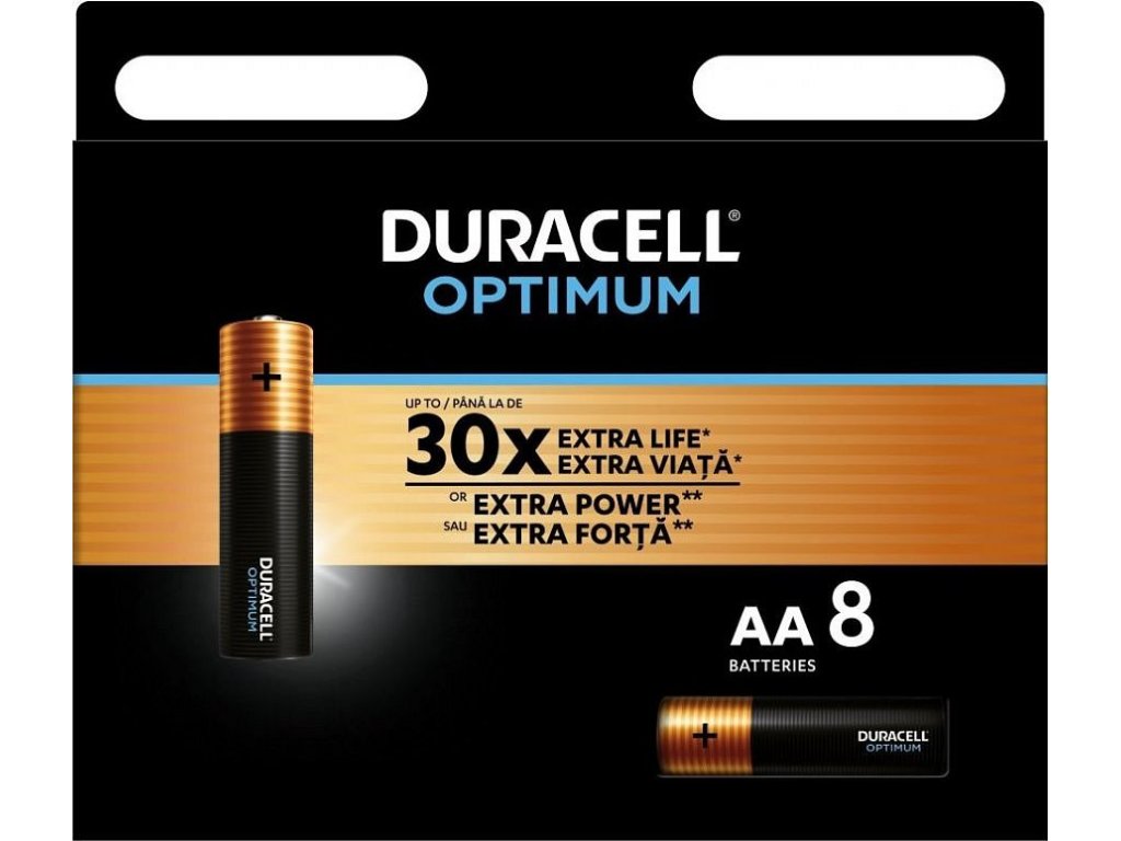DURACELL Optimum AA 8 ksAlkalické baterie s extra výkonem vhodné pro napájení zařízení s vysokou spotřebou energie, jako jsou digitální fotoaparáty, fotoblesky, hračky na baterie či přenosná rádia. Technologie Duralock udržuje nepoužívané baterie Duracell při běžném skladování jako nové a nabité po dobu až 10 let. Balení obsahuje 8 kusů baterií.