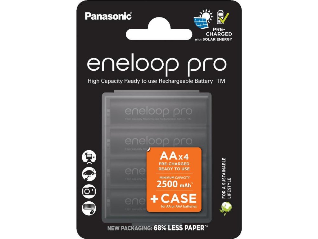 Toto balení Eneloop pro obsahuje 4 baterie AA a pouzdro pro snadné skladování.