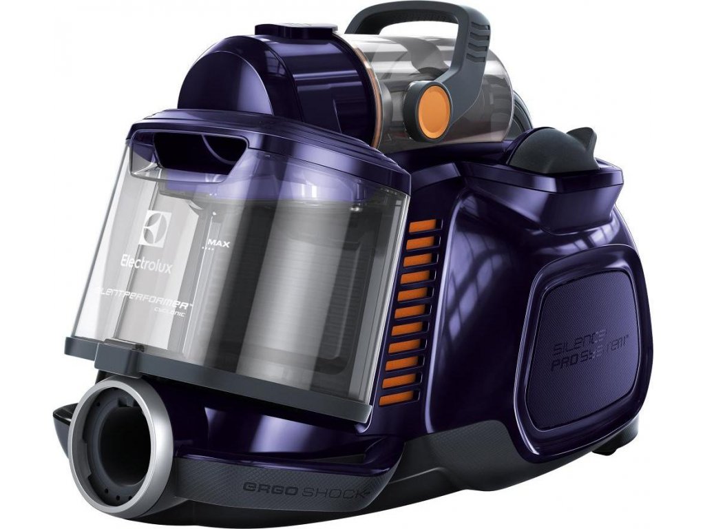 Bezsáčkový vysavač SilentPerformer Cyclonic, příkon 650 W, omyvatelný hygienický filtr, délka přívodního kabelu 6m, akční rádius 9m, podlahová hubice DustMagnet, nesené příslušenství 2v1 (štěrbinová hubice a hubice na čalounění), teleskopické trubky, objem nádoby na prach 1.4l. Barva tmavě modrá