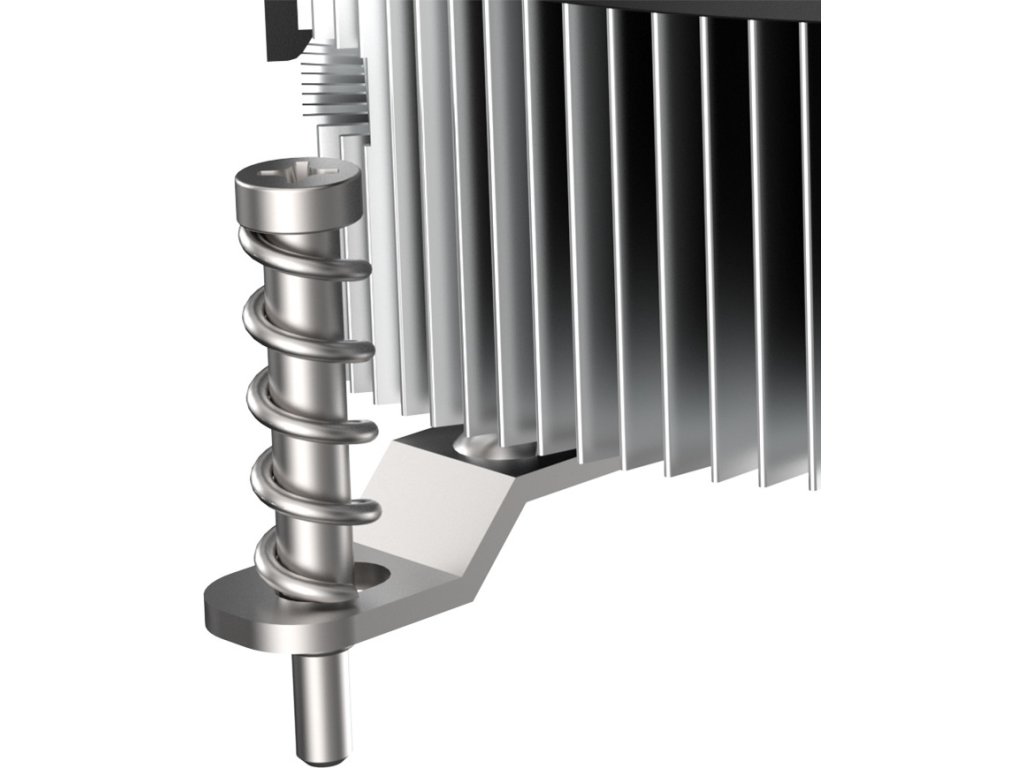 Tichý hliníkový chladič s extra bezpečnou montáží pomocí zadní desky a šroubů. 95mm ventilátor PWM a vícesměrový chladič pro úsporné a účinné chlazení. Určeno pro procesory Intel Core i5 s výkonem až 80 W.