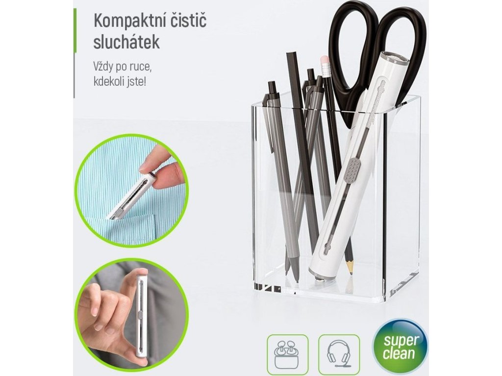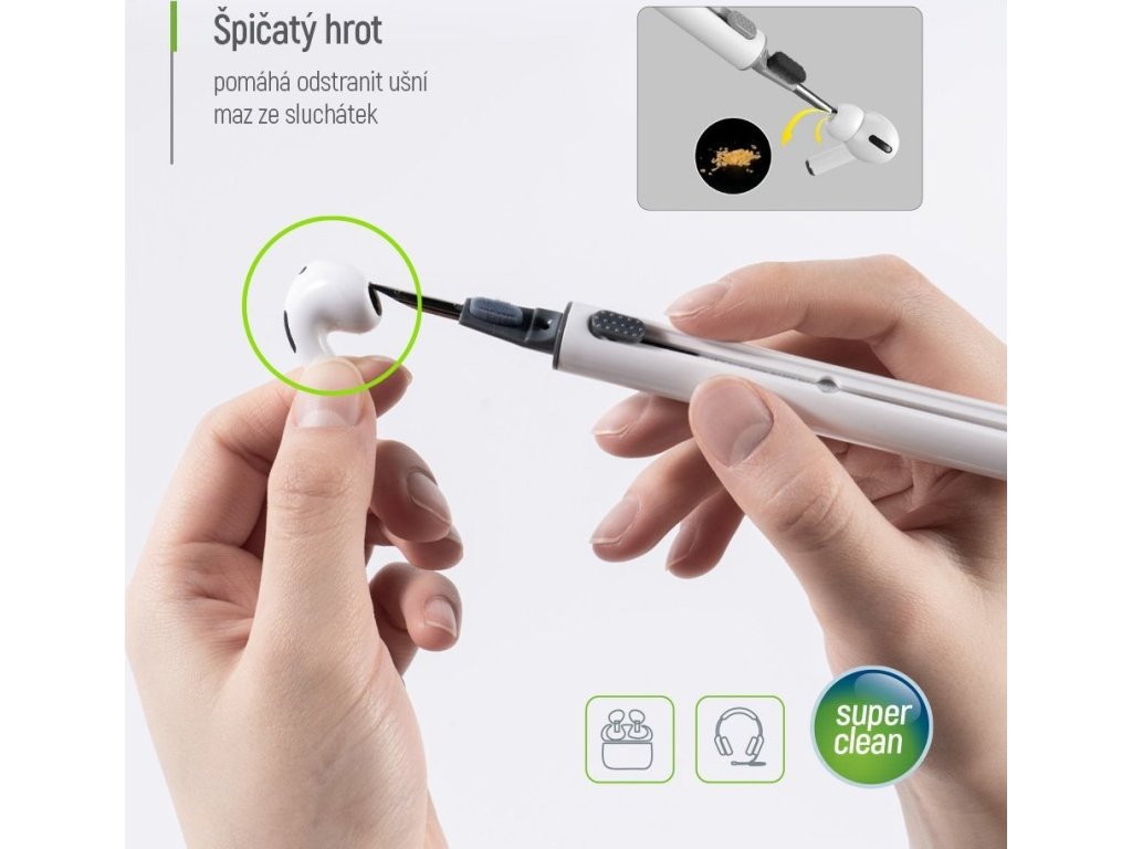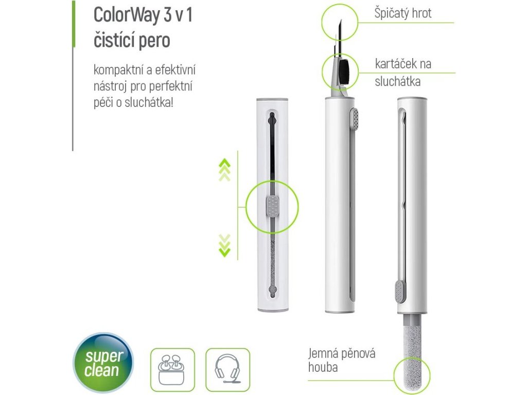 ColorWay CW-1131Univerzální čisticí nástroj navržený pro důkladnou údržbu sluchátek. Díky třem různým nástavcům efektivně odstraňuje nečistoty, prach a ušní maz z obtížně přístupných míst, aniž by poškodil povrch či jemné komponenty. Kompaktní a lehký design umožňuje snadné přenášení a použití kdekoli – doma, v kanceláři nebo na cestách. Každá část čisticího pera má svou specifickou funkci. Pěnová houba se dostane do hlubších částí pouzdra sluchátek a odstraní usazený prach. Jemný kartáček efektivně vyčistí mřížky reproduktorů a další citlivé části, zatímco špičatý hrot pomůže odstranit ušní maz. Díky intuitivnímu posuvnému mechanismu lze snadno přepínat mezi jednotlivými nástavci podle aktuální potřeby.