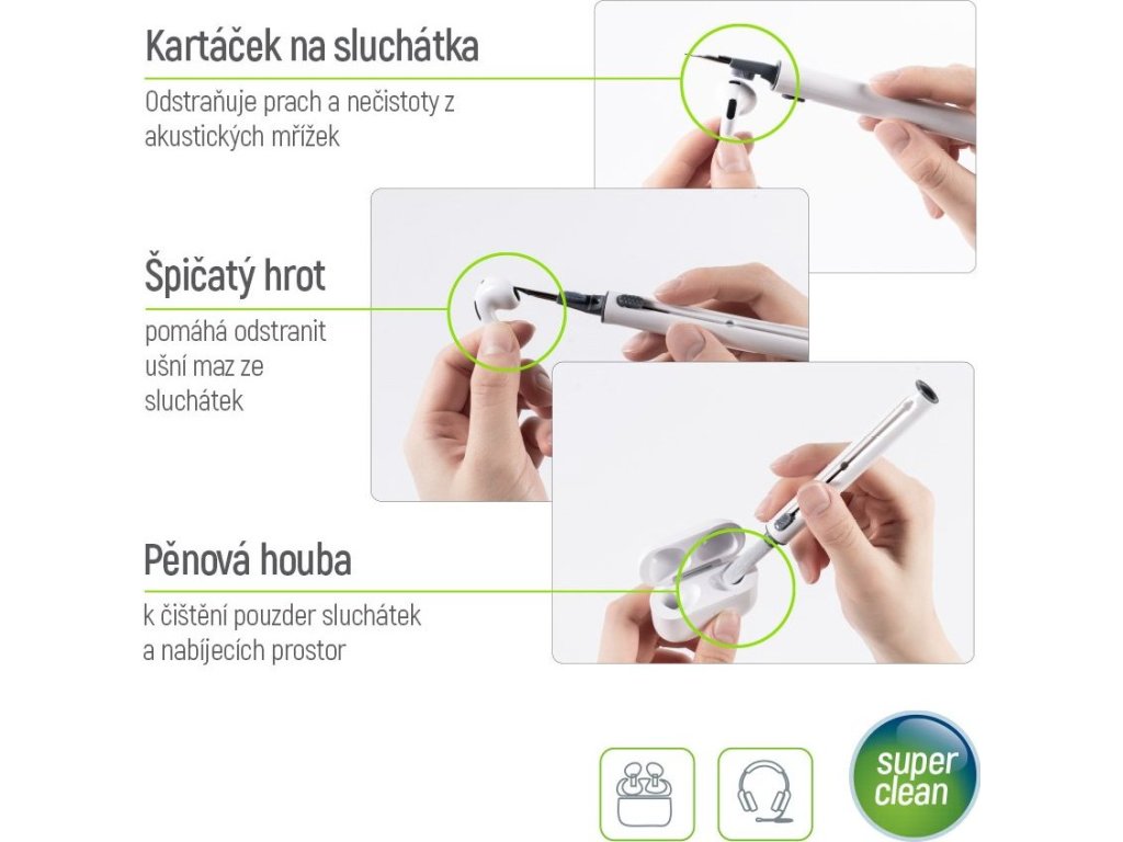 - Šetrné a bezpečné čištění – materiály navržené pro efektivní odstranění nečistot bez poškození sluchátek.