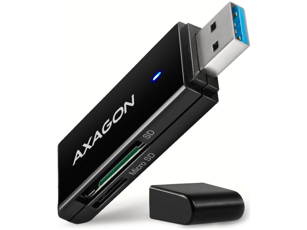 Štíhlá USB 3.2 Gen 1 čtečka paměťových karet AXAGON CRE-S2N SUPERSPEED podporuje všechny současné verze SD a microSD karet včetně SDXC a microSDXC s kapacitou až 2TB.