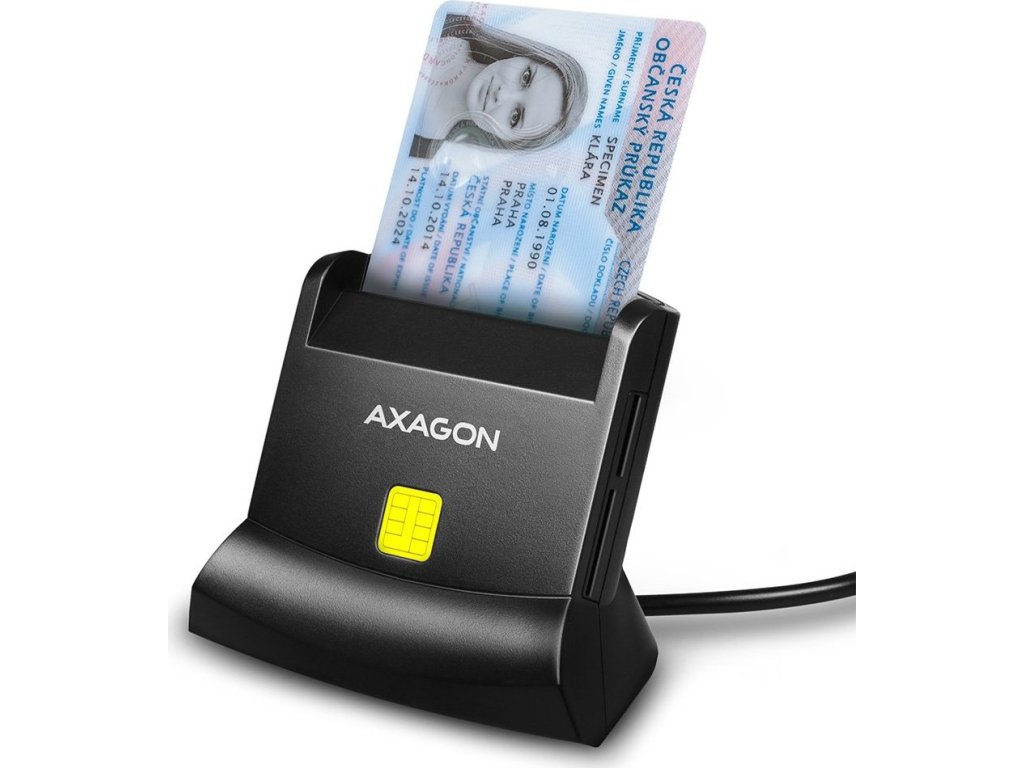 Stojánková stolní čtečka Smart card / ID card AXAGON CRE-SM2 s USB 2.0 rozhraním obsahuje navíc sloty pro paměťové karty SD, microSD a SIM karty. Card reader podporuje všechny běžné formáty Smart karet, čipových karet a dalších kontaktních karet včetně bankovních platebních karet. Čtečka je plně kompatibilní s aplikací eObčanka.