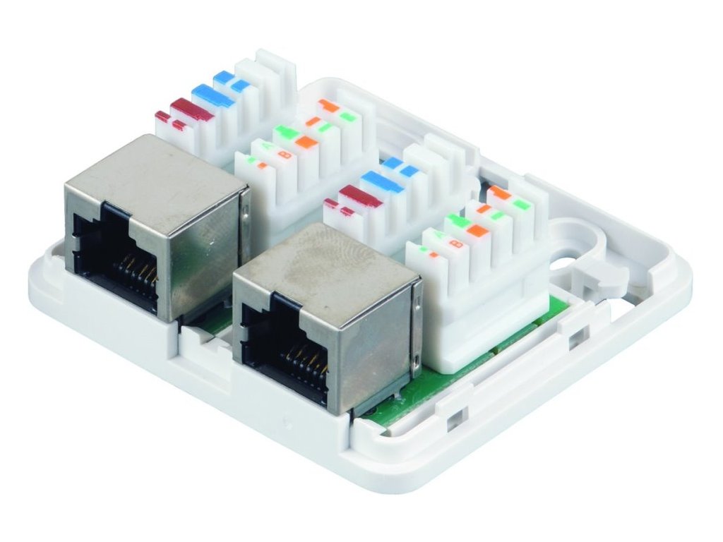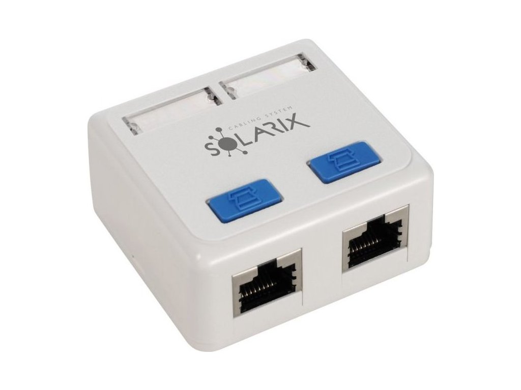 Tato stíněná zásuvka Solarix SX288 je osazena dvěma porty typu RJ45 a je určena k instalaci na omítku. Datový kabel se zařezává do IDC svorkovnice typu 110, která je označena barevným schématem podle typu zapojení, a to buď podle standardu T568A, nebo T568B. Tato kompaktní zásuvka s velmi hezkým designem a pevným provedením bez problémů splňuje všechny parametry definované v mezinárodních normách ANSI/TIA 568, ISO/IEC 11801 a EN 50173 pro kategorii 5E a třídu vedení Class D, včetně všech nejnovějších dodatků. Zásuvky SX288 nabízí skvělý výkon, vysokou spolehlivost a velmi jednoduchou instalaci. Součástí balení jsou plastové štítky modré a červené barvy, které slouží k označení jednotlivých portů. Nechybí ani oboustranná lepící fólie, která je určena k uchycení zásuvek na hladkém povrchu. Barva zásuvky je bílá.