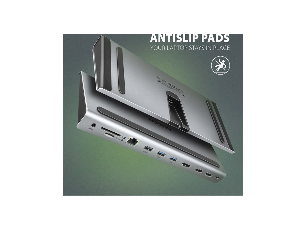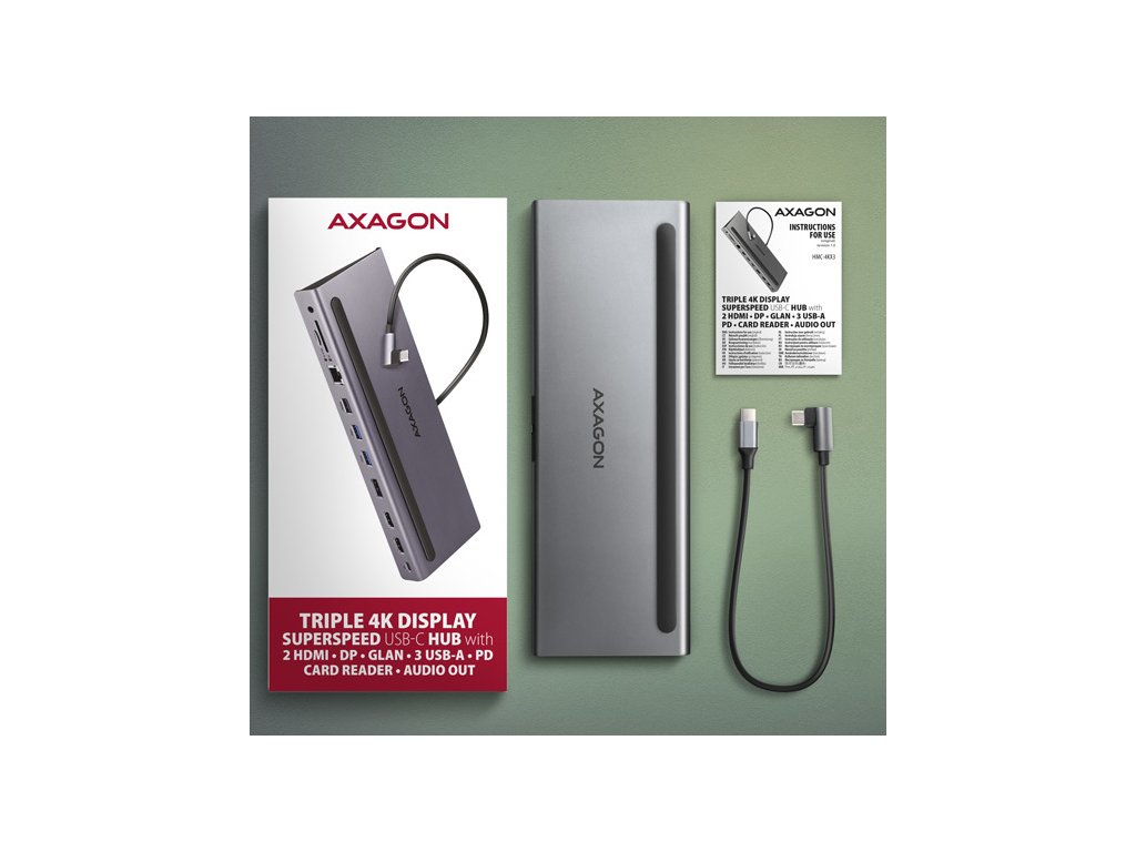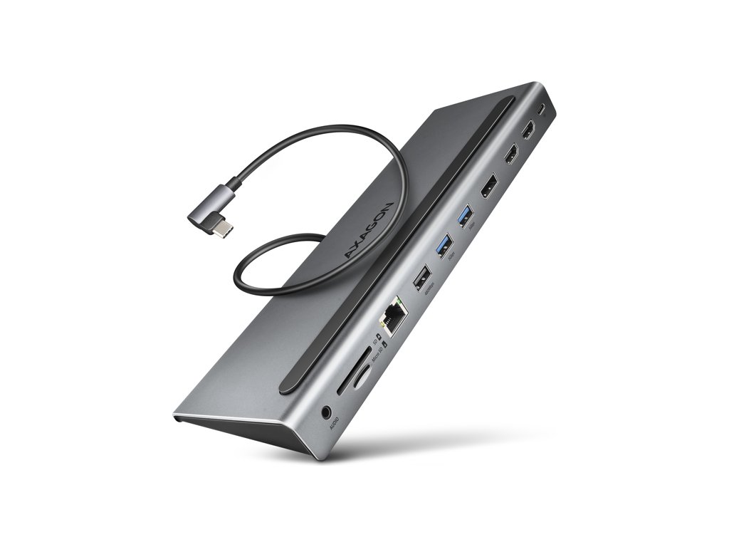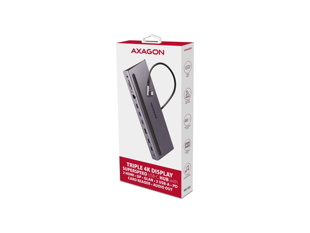 AXAGON HMC-4KX3 USB 5Gbps hub, 3x USB-A, 2x HDMI, DP, RJ-45 GLAN, SD/microSD, audio, PD 100W, kabel USB-C 40cm