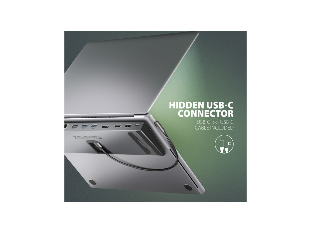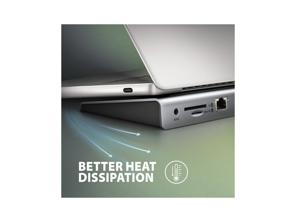Robustní hliníkové tělo zajistí mechanickou odolnost i kvalitní chlazení dokovací stanice. Klínový tvar hubu vybízí k jeho použití jako podložky notebooku pro jeho lepší chlazení a ergonomickou polohu. Také přibalený USB-C kabel je navržen pro použití hubu jako podložky notebooku, optimální délka 40 cm spolu se zahnutým konektorem jej umožňuje téměř celý skrýt pod notebookem a přispět tak k dojmu čistého stolu. USB-C kabel je odpojitelný a lze jej tak v případě potřeby nahradit delším kabelem.