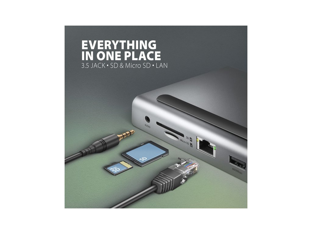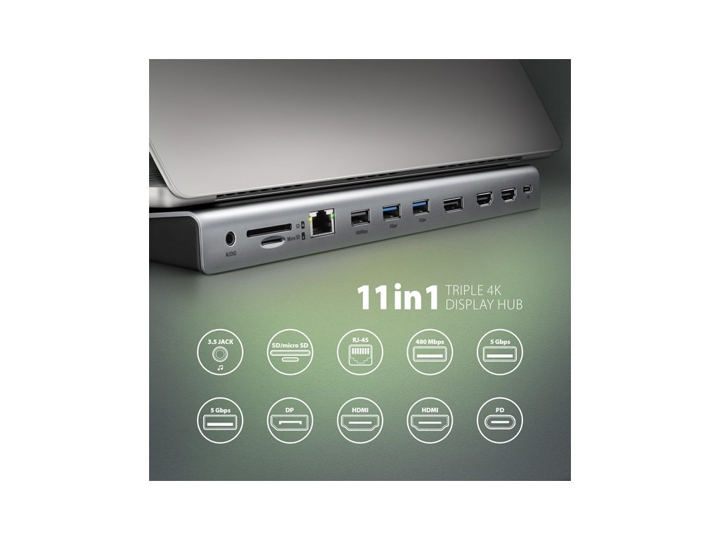 Multiportový USB-C 5Gbps TRIPLE 4K DISPLAY hub AXAGON HMC-4KX3 rozšíří Váš notebook o devět portů a čtečku paměťových karet SD / microSD. Přes oboustranný USB-C konektor snadno a rychle připojíte k počítači až tři monitory, tři USB zařízení, Gigabitovou ethernet síť, sluchátka a čtečku karet současně. Zároveň získáte možnost napájení notebooku pomocí technologie Power Delivery. USB-C hub tak zastane funkci univerzální a výkonné dokovací stanice 11v1 pro moderní notebooky.