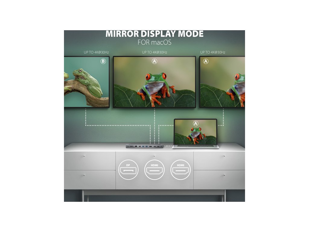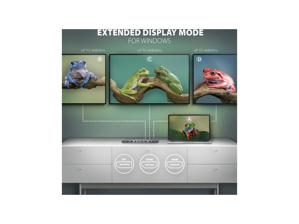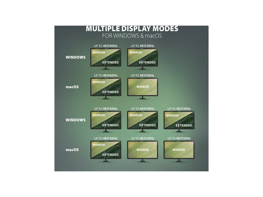 Každý ze tří video výstupů (2x HDMI + 1x DisplayPort) poskytuje kvalitní obraz až do rozlišení 4K/60Hz Ultra HD. Podporovány jsou také vysoké frekvence v oblíbených hráčských rozlišeních 2K/144Hz nebo FullHD/240Hz. I při připojení tří monitorů současně zvládne dokovací stanice zajistit rozlišení až 4K/30Hz na každém z nich. Díky podpoře HDR (vysoce dynamický rozsah) si můžete bez omezení vychutnat výrazně rozšířený rozsah barev a kontrastů. Pro správné fungování video výstupu je nutné, aby USB-C port notebooku podporoval DisplayPort Alternate Mode (DP Alt Mode) nebo Thunderbolt 3/4. Podpora výše uvedených max. podporovaných rozlišení a frekvencí vyžaduje připojení k počítači s DisplayPort verze 1.4.
