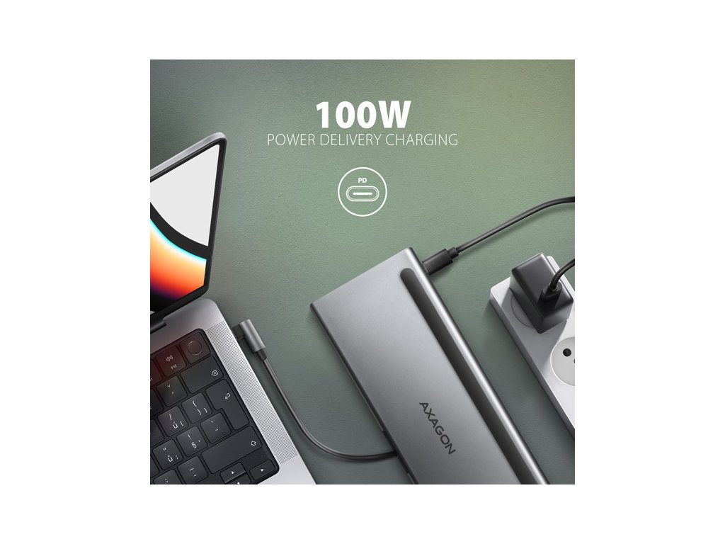USB-C konektor je vyhrazen pouze pro napájení a současné dobíjení notebooků pomocí technologie Power Delivery 3.0 výkonem až 100W. Do hubu zapojíte USB-C Power Delivery nabíječku a hub připojíte k notebooku. Tím také uvolníte jeden USB-C port. Podmínkou je notebook s podporou nabíjení z USB-C portu pomocí Power Delivery a vhodná PD nabíječka.