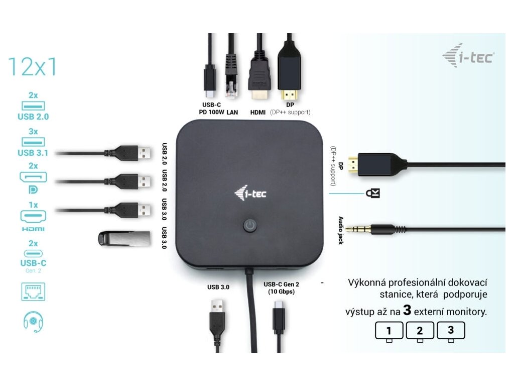 Vysoce výkonná kancelářská dokovací stanice USB-C, která podporuje až 3x externí monitor v rozlišení 4K. Stanice je kompatibilní s jakýmkoliv notebookem vybaveným portem USB-C, USB4 nebo Thunderbolt 3/4. 6x USB port, spolehlivé a rychlé připojení do podnikové sítě díky integrovanému LAN portu a podpora instalace za monitor, to vše z této dokovací stanice dělá ideálního společníka pro profesionály. Samozřejmostí je podpora nabíjení vašeho notebooku či tabletu, a to až 100 W.