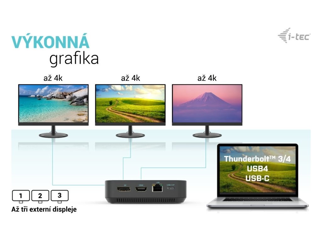 • Připojte až tři externí monitory 4K/30Hz