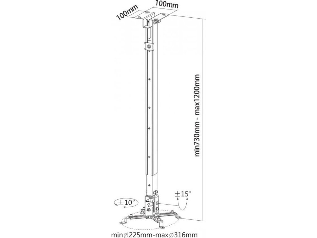 Reflecta Tapa 73-120 cmOcelový držák na strop pro projektory. Nastavitelná vzdálenost od stropu, funkce náklonu o ±15° a otočení o ±10° umožňuje maximální flexibilitu zobrazení. Nosná ramena se hodí pro většinu projektorů se vzdáleností otvorů od 225 mm do 316 mm. Maximální zatížení tohoto držáku je 20 kg. Kabely lze navíc ukrýt uvnitř sloupku.