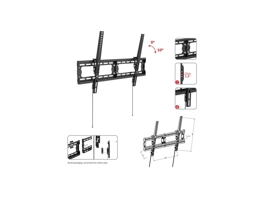 Držák na TV, s prostorem pro uložení kabelů, VESA 600x400, maximální nosnost 75 kg, vhodné pro úhlopříčky 32"-65", možnost nastavení vzdálenosti od zdi 33mm, nastavitelný sklon
