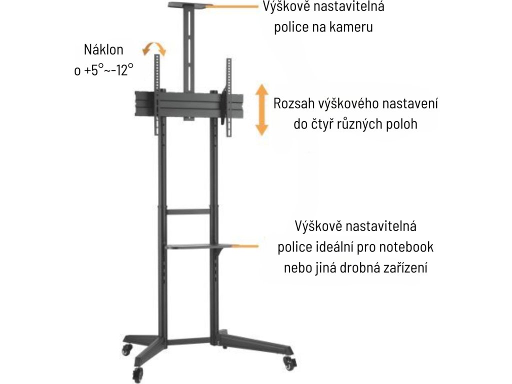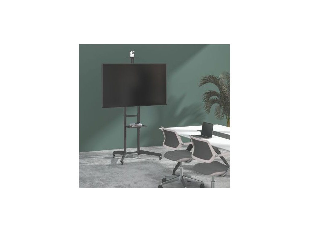Všestranný pojízdný stojan Brateck T1040T je určen pro instalaci TV s plochou obrazovkou s úhlopříčkami od 37“ do 70“ a hmotností až 50 kg. Stojan poskytuje stabilní podporu a díky integrovaným kolečkům s možností aretace zároveň umožňuje snadné a bezpečné přemístění dle potřeby. Montážní deska pro upevnění TV je nastavitelná ve čtyřech různých výškových úrovních, jednoduchá změna náklonu TV v rozsahu +5°~-12° pak umožňuje nastavení optimálního pozorovacího úhlu. Stojan je navíc vybaven jednou výškově stavitelnou poličkou na kameru s nosností 5 kg a jednou výškově nastavitelnou poličkou na příslušenství s nosností 5 kg. Díky tomuto příslušenství je stojan vhodný pro pořádání telekonferencí, ale také pro využití při kancelářských a školních prezentacích, nebo při domácí zábavě.