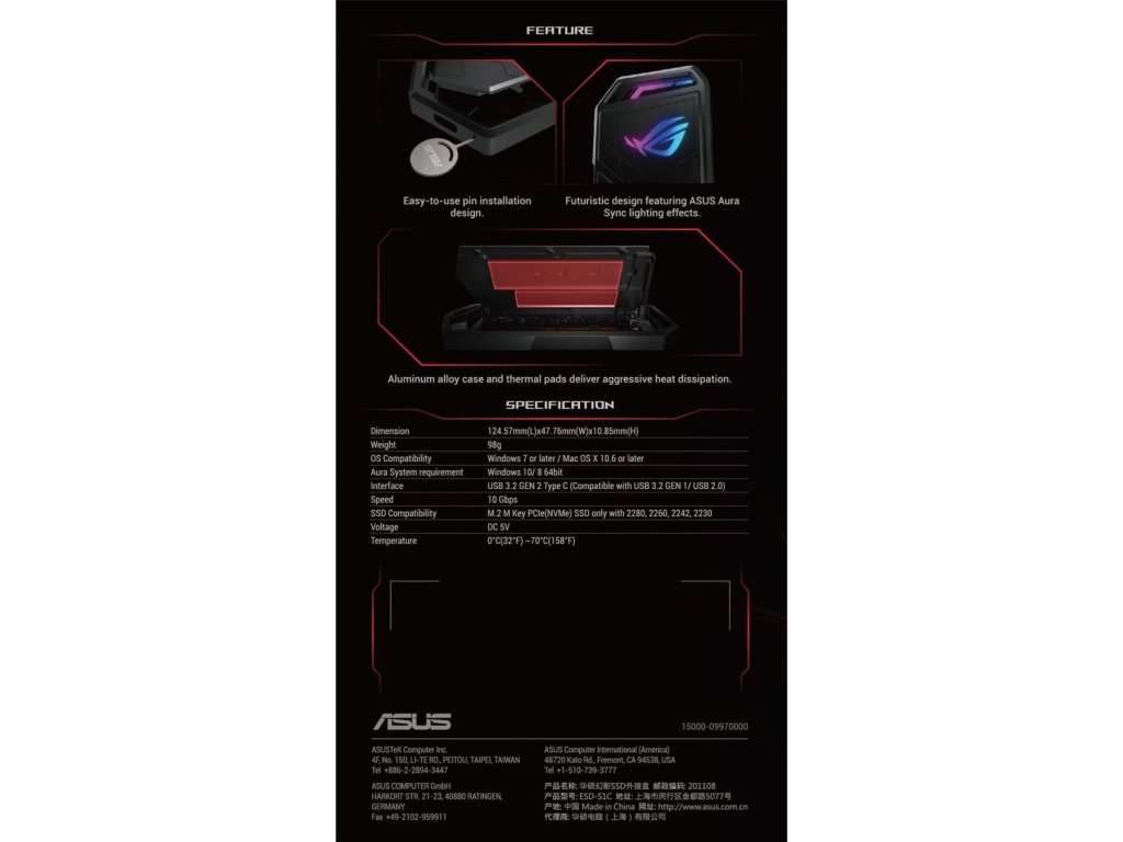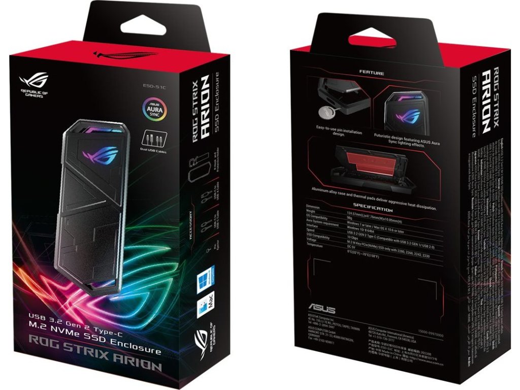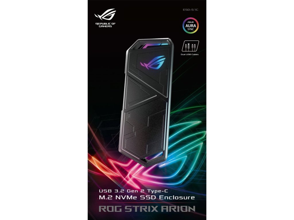 ASUS Strix Arion je externí box určený pro uložení M.2 NVM Express SSD disku. Pouzdro je z hliníkové slitiny, má tedy vynikající schopnost odvodu tepla.