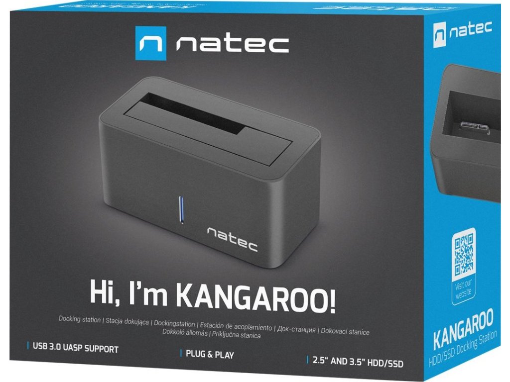 Dokovací stanice Kangaroo podporuje 2,5" a 3,5" HDD i SSD s rozhraním SATA I/II/III. Díky funkci Plug&Play, která je kompatibilní s většinou operačních systémů Windows a IOS si počítač automaticky nainstaluje potřebné ovladače.