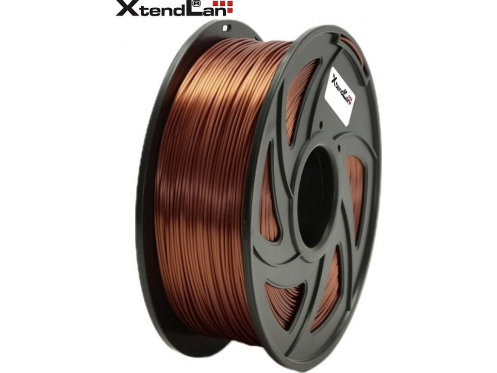 XtendLAN PETG filament 1,75 mm cihlově hnědý 1 kgPlastové vlákno (filament) pro 3D tisk, v návinu na cívce. PET-G (PolyEtylénTereftalát Glykolem modifikovaný) je materiál velmi známý díky plastovým lahvím. PETG v sobě spojuje to nejlepší z vlastností ABS a PLA pro 3D tisk. Jde o pevný a houževnatý materiál. Odolností se materiál blíží polykarbonátům. Vyznačuje se velmi malým tepelným smrštěním a je vhodný pro tisk i velkých objektů. Má velkou odolnost proti rozpouštědlům a kyselinám. Odolává vysokým i nízkým teplotám. Při 3D tisku má velmi dobrou přilnavost k podložce. Vytištěný předmět lze tepelně leštit. Filament je chráněný vakuovým balením a v každém balení je přítomen vysoušecí sáček, který zabraňuje případnému působení vlhkosti na materiál. Dodáváno v kartónovém obalu s okénkem pro kontrolu barevnosti.