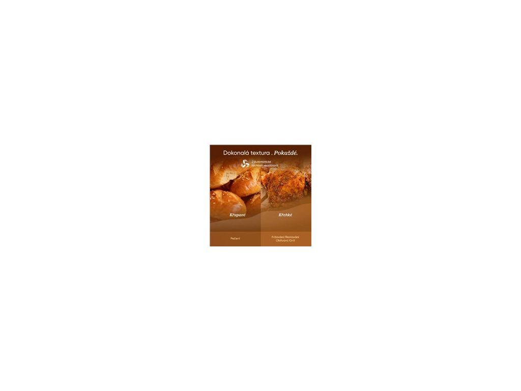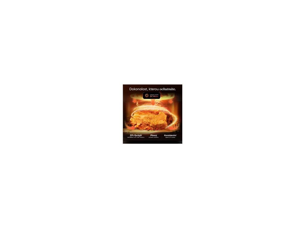 Uvnitř pracují dva výkonné DC motory, které zajišťují rychlejší ohřev a efektivnější proudění vzduchu. To znamená kratší dobu přípravy při zachování nižší spotřeby energie. Jídlo je hotové rychleji, ale bez kompromisů v chuti či textuře. Skutečné win-win řešení.