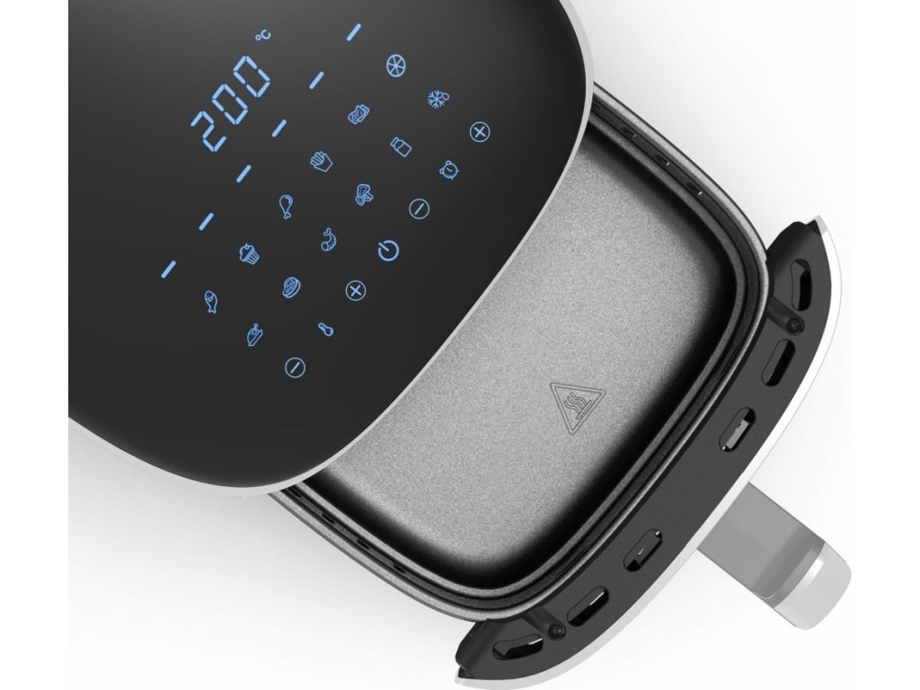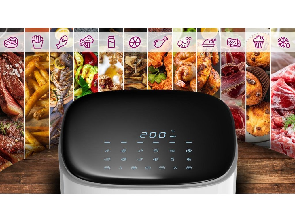 • 12 přednastavených programů: Ryby & Muffiny & Kuřecí stehna & Hranolky & Sušené maso & Sušené houby, ovoce a zelenina & Kuře & Steak & Krevety & Zelenina & Jogurt & Rozmrazování