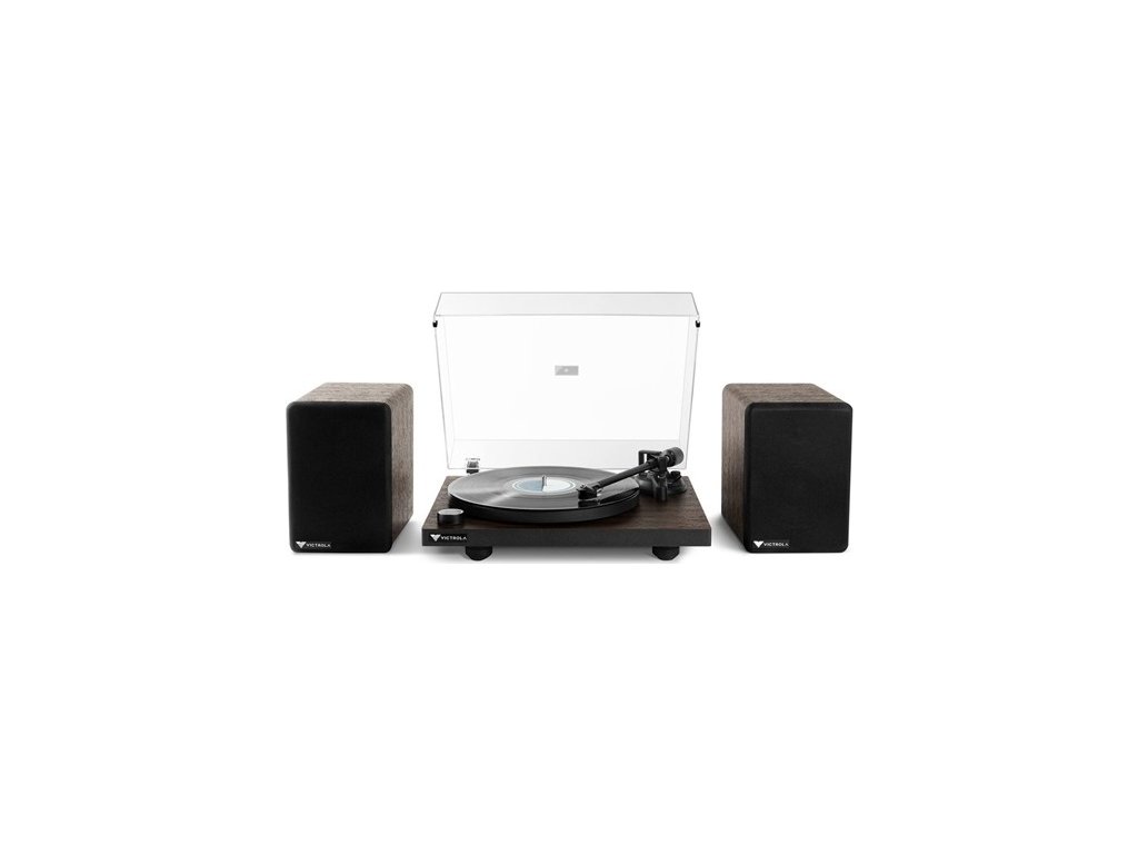 gramofon s reproduktory, hnědý, vestavěný předzesilovač, rychlost 33,3, 45 otáček za minutu, moderní design, náhon řemínkem, poloautomatické ovládání, rovné raménko, elektromagnetická (MM/MC) přenoska, Bluetooth, Bluetooth OUT, RCA výstup, AUX vstup.