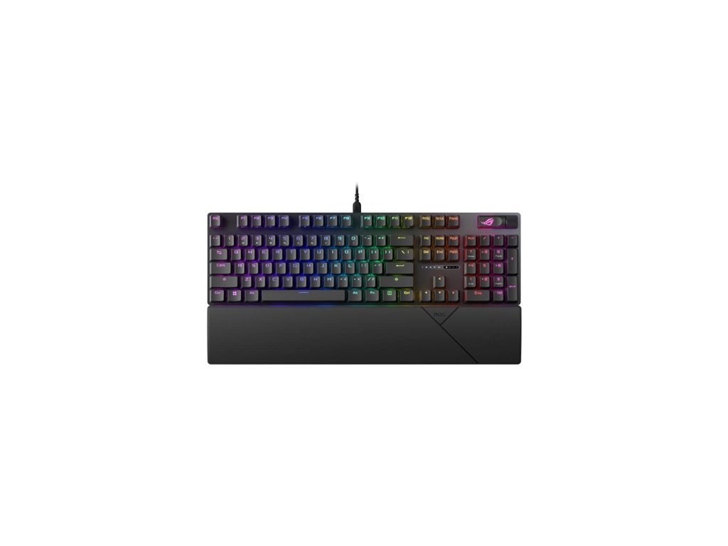 Herní klávesnice ROG Strix Scope II X s mechanickými spínači ROG NX V2 s možností výměny za provozu, pěnovým tlumením zvuku, zdvojenými klávesami PBT nebo ABS s UV povlakem, streamovacími klávesami, multifunkčními ovládacími prvky, třemi úhly sklonu a opěrkou zápěstí.