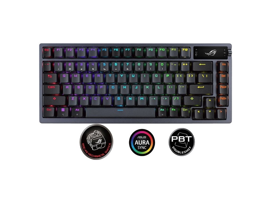Zakázková herní klávesnice ROG Azoth s tvarovým faktorem klávesnice 75, těsněním, třívrstvou tlumicí pěnou a kovovým horním krytem, vysoce přizpůsobitelná s předem namazanými mechanickými spínači ROG NX vyměnitelnými za provozu, stabilizátory klávesnice ROG, kryty kláves PBT doubleshot a mazací sadou, tri - připojení režimu s 2,4 GHz technologií SpeedNova, OLED displejem, třícestným ovládacím knoflíkem, třemi úhly náklonu a podporou Mac