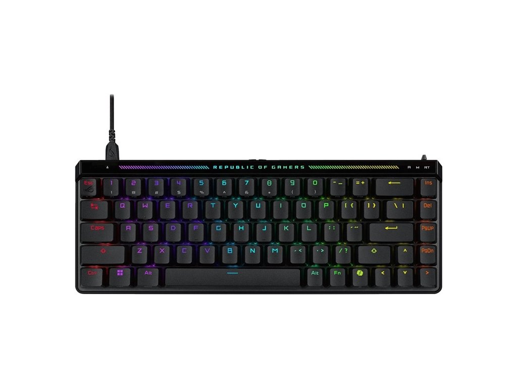 ROG Falchion Ace HFX 65% analogová herní klávesnice s magnetickými spínači ROG HFX, přepínač Rapid Trigger, režim Speed ??Tap, interaktivní dotykový panel, obnovovací frekvence 8000 Hz, pětivrstvé tlumení a silikonové těsnění, duální porty Type-C, tři úhly sklonu a krycí pouzdro