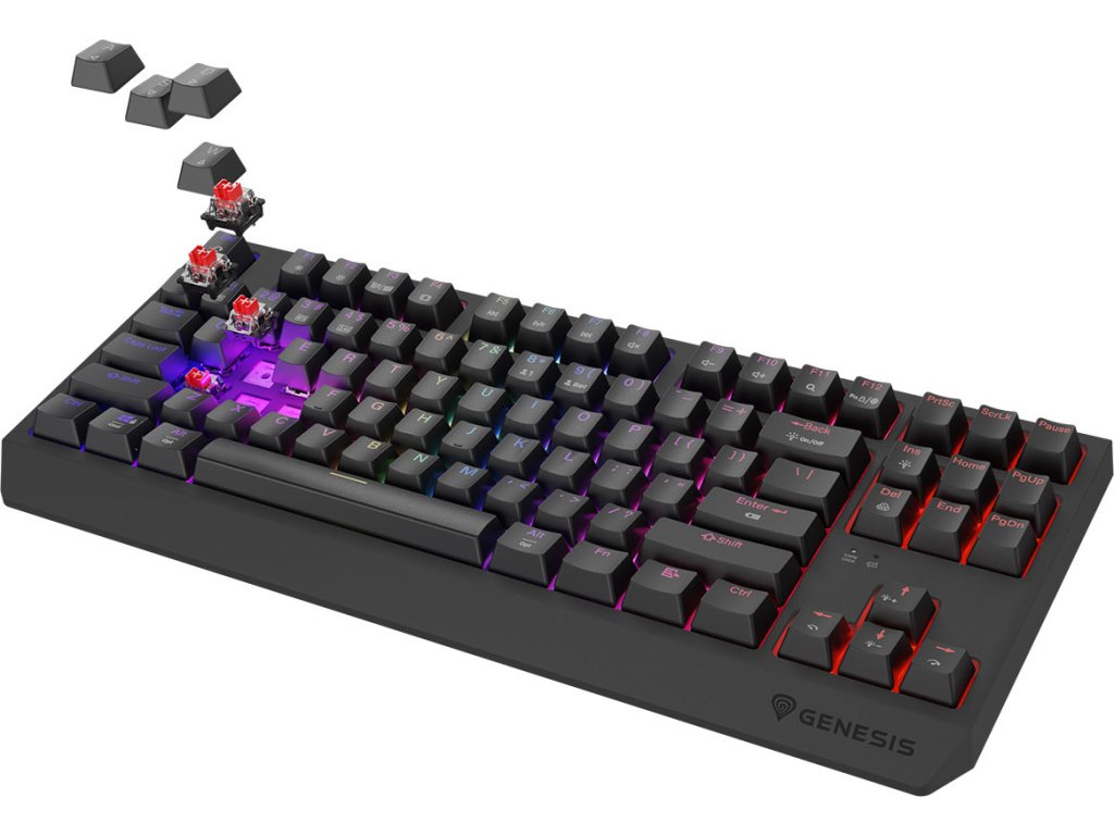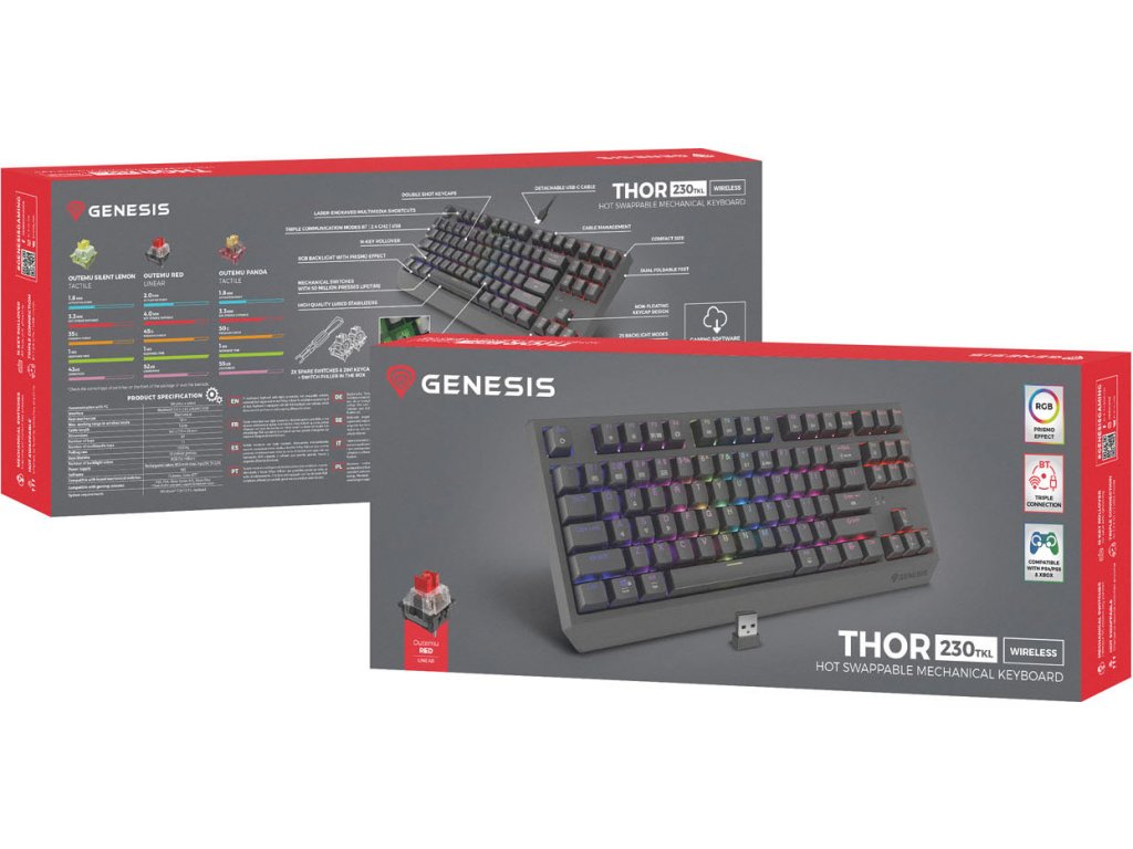 Klávesnice GENESIS Thor 230 TKL Wireless je vybavena různými typy spínačů. Každý z nich se vyznačuje vysokou přesností, aktivací bez ohledu na místo stisknutí klávesy a vysokou dynamikou. Víme však, že jako hráč můžete mít své vlastní preference. Proto jsme v GENESIS Thor 230 TKL Wireless implementovali hot - swap - techniku, která vám umožní vyměnit jakýkoli třípinový mechanismus za mikrospínač od společností jako Outemu, Akko, KTT. Jednoduše vytáhněte nainstalovaný mechanismus a zapojte nový. Díky systému Hot Swap také nemusíte kupovat novou klávesnici, když jeden spínač selže. Můžete jej vyměnit během několika sekund.