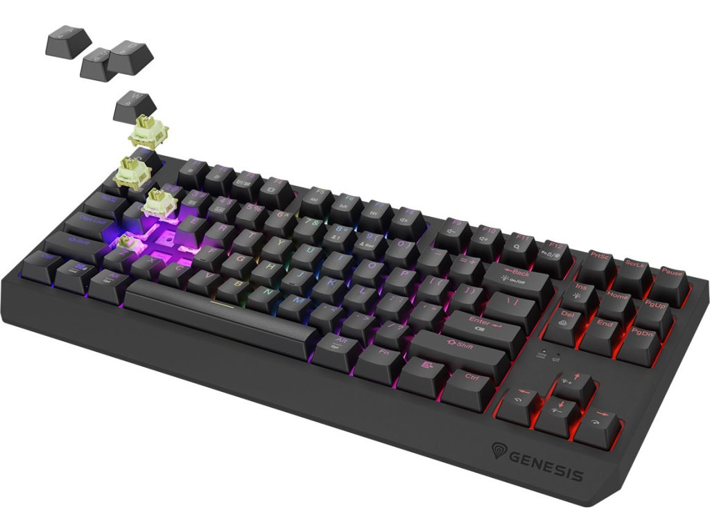 Klávesnice GENESIS Thor 230 TKL Wireless je vybavena různými typy spínačů. Každý z nich se vyznačuje vysokou přesností, aktivací bez ohledu na místo stisknutí klávesy a vysokou dynamikou. Víme však, že jako hráč můžete mít své vlastní preference. Proto jsme v GENESIS Thor 230 TKL Wireless implementovali hot - swap - techniku, která vám umožní vyměnit jakýkoli třípinový mechanismus za mikrospínač od společností jako Outemu, Akko, KTT. Jednoduše vytáhněte nainstalovaný mechanismus a zapojte nový. Díky systému Hot Swap také nemusíte kupovat novou klávesnici, když jeden spínač selže. Můžete jej vyměnit během několika sekund.