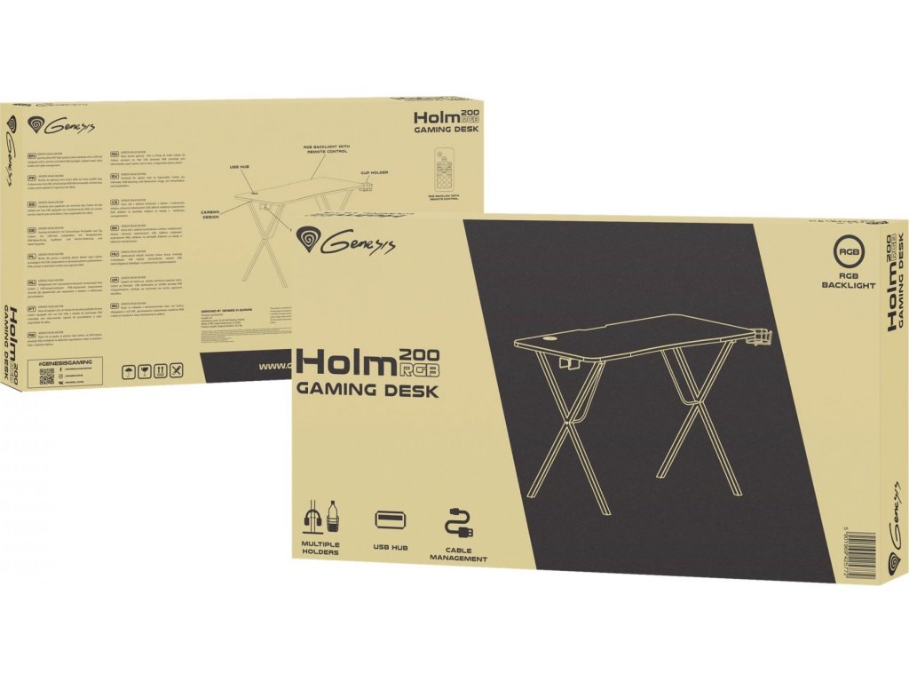 Genesis Holm 200 RGB se pyšní vynikajícím cable managementem, který umožňuje převzít plnou kontrolu nad všemi kabely a udržet na stole pořádek. Důkazem toho je vyhloubení v zadní části desky, které umožňuje udržení kabelů klávesnice, myši a jiného příslušenství na svém místě. O pořádek ve spodní části stolu se stará kovový držák, který směstná přepěťovou ochranu se všemi kabely.
