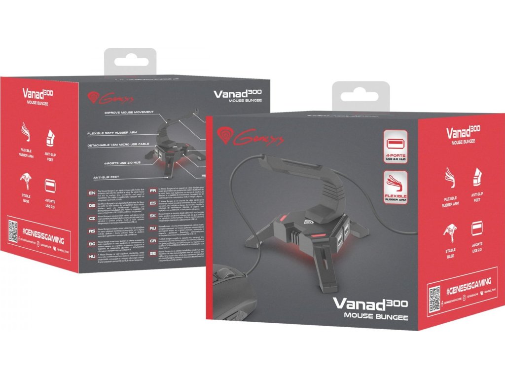 Mouse Bungee Genesis Vanad 300 je malé zařízení, které poddržuje kabel myši, čímž zvyšuje její kontrolu a rychlost pohybů během virtuálních bitev. Flexibilní rameno z měkké gumy umožňuje hráči svobodně pohybovat myší a plní také roli organizéru, což pomáhá udržet pořádek mezi množstvím zamotaných kabelů. Gumové svorky na rameni se přizpůsobí jakékoliv tloušťce kabelu.