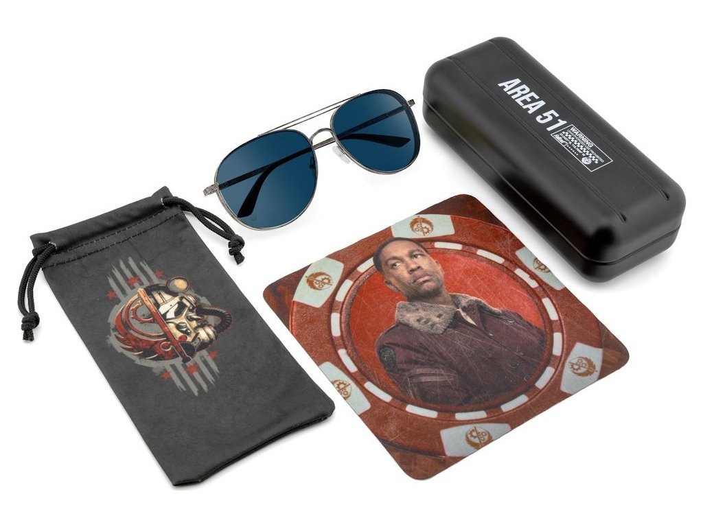 Každé brýle jsou dodávány s kolekcí exkluzivního příslušenství včetně kovového pouzdra „Area 51“, mikrovláknového pouzdra s motivy Brotherhood a čisticího hadříku s designem Fallout.