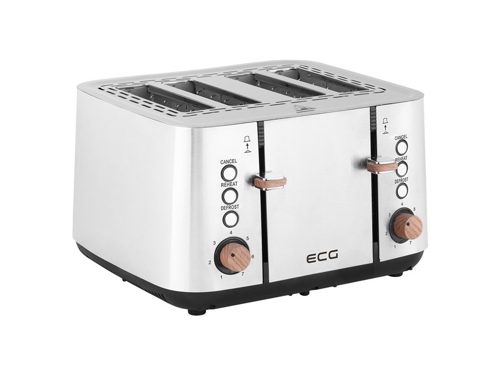 čtyřštěrbinový, rozpékač pečiva, plynulá 7 stupňová regulace, automatické vypnutí, funkce přihřívání a rozmrazování, zásuvka na zbytky pečiva, gumové nožičky, možnost namotání kabelu, světelná signalizace provozu, příkon 1500-1850 W