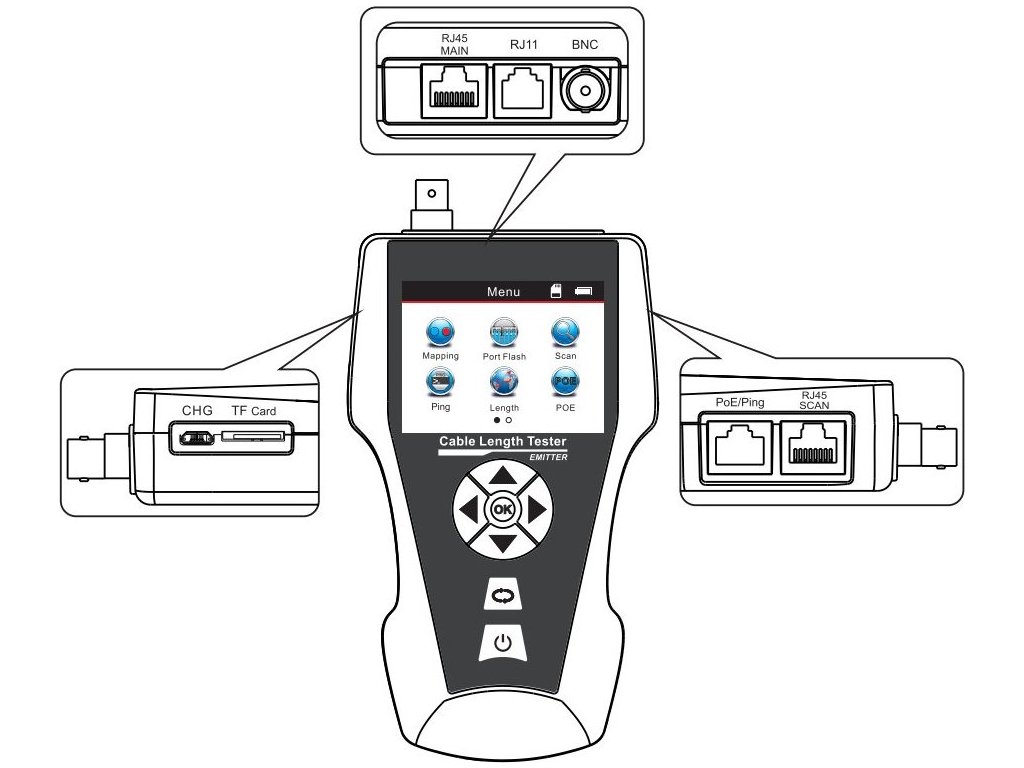 Pokročilý tester pro testování a diagnostiku různých typů kabelů/vedení. Využívá technologii TDR (Time Domain Reflectometry) k přesné lokalizaci a identifikaci závad ve vedení. Zařízení je vybaveno velkým LCD displejem, který zobrazuje všechny patřičné informace a podporuje vícejazyčné nastavení. Kromě toho je vybaven vestavěným tónovým generátorem a funkcí vyhledávání portů, takže je ideální pro testování síťových kabelů, telefonních linek a videokabelů.