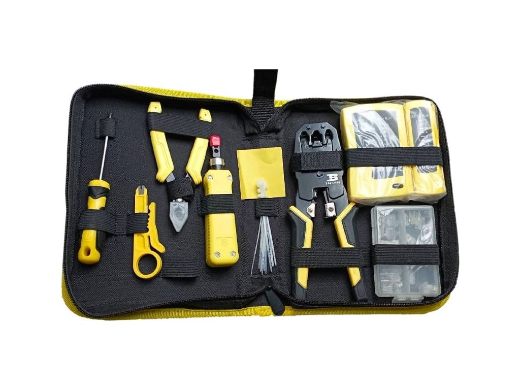 Sada nářadí pro síťaře i domácí kutily, 11ks nářadí, Tester síťových kabelů, krimpovací kleště, štípací kleště, šroubovák, konektory RJ45