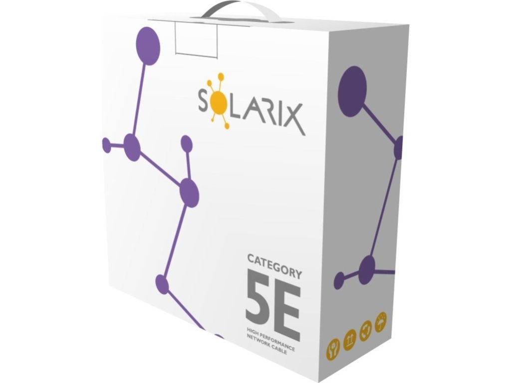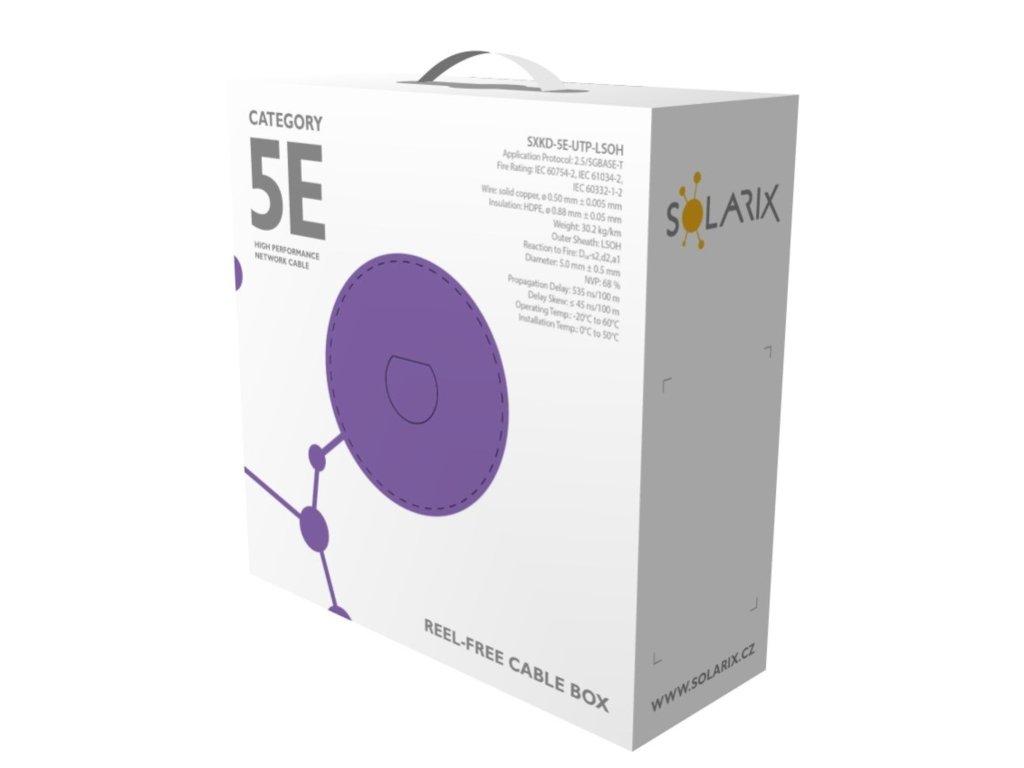 Instalační kabel Solarix s označením SXKD-5E-UTP-LSOH je spolehlivý nestíněný kabel kategorie 5E, který je testován až do šířky pásma 350 MHz, a je určený pro provoz ethernetových protokolů, včetně 2.5GBASE-T a 5GBASE-T*. Konstrukce kabelu je U/UTP, typ pláště LSOH s třídou reakce na oheň Dca-s1,d2,a1. Vodiče kabelu jsou vyrobeny z kvalitního měděného drátu s čistotou mědi 99,97%. Kabel bez problémů splňuje požadavky z mezinárodních standardů ISO/IEC 11801, EN 50173 a ANSI/TIA 568.2-D. Výkonové parametry tohoto kabelu byly otestovány nezávislou testovací zkušebnou FORCE TECHNOLOGY v rámci programu EC Verified, a to na nejvyšší úroveň tzv. Component Level. Certifikát je k dispozici zde na webu v záložce "Odkazy" nebo přímo na stránkách laboratoře FORCE. V případě CPR (nařízení EU č. 305/2011) je kabel testován v systému posuzování vlastností AVCP 3. Stejně jako ostatní kabely Solarix, je i kabel SXKD-5E-UTP-LSOH značen metráží po 1 m v rozsahu od 0 do 100 m. Kabel je dodáván ve vysoce odolném třívrstvém leštěném kartónovém boxu (vždy barevně odlišeném podle typu kabelu), na kterém jsou uvedeny všechny nezbytné produktové informace, včetně čárových kódů, výrobní šarže, popisu a nejdůležitějších technických parametrů.
