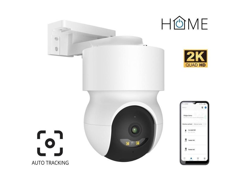 Bezdrátová venkovní otočná voděodolná Wi-Fi kamera s automatickým natáčením za pohybem, obousměrným přenosem zvuku, detekcí pohybu a zvuku, barevným nočním viděním pomocí LED svícení a IR přísvitem až do vzdálenosti 20 m, vysokým rozlišením 2K (3MPx), a dalšími funkcemi. Pro snadné připojení obsahuje 4m dlouhý napájecí kabel.